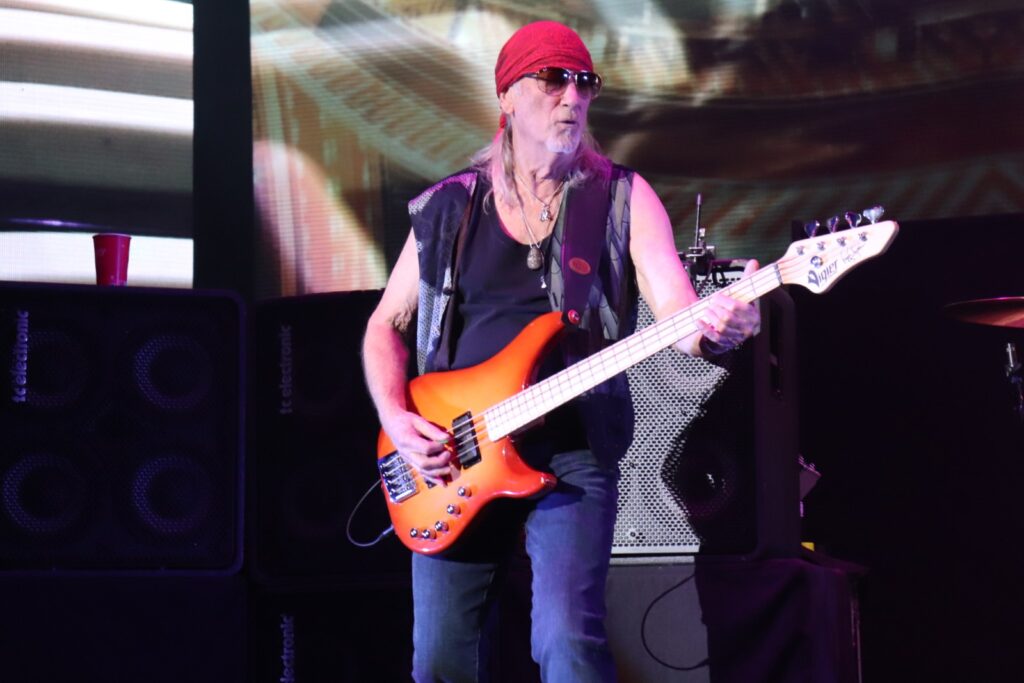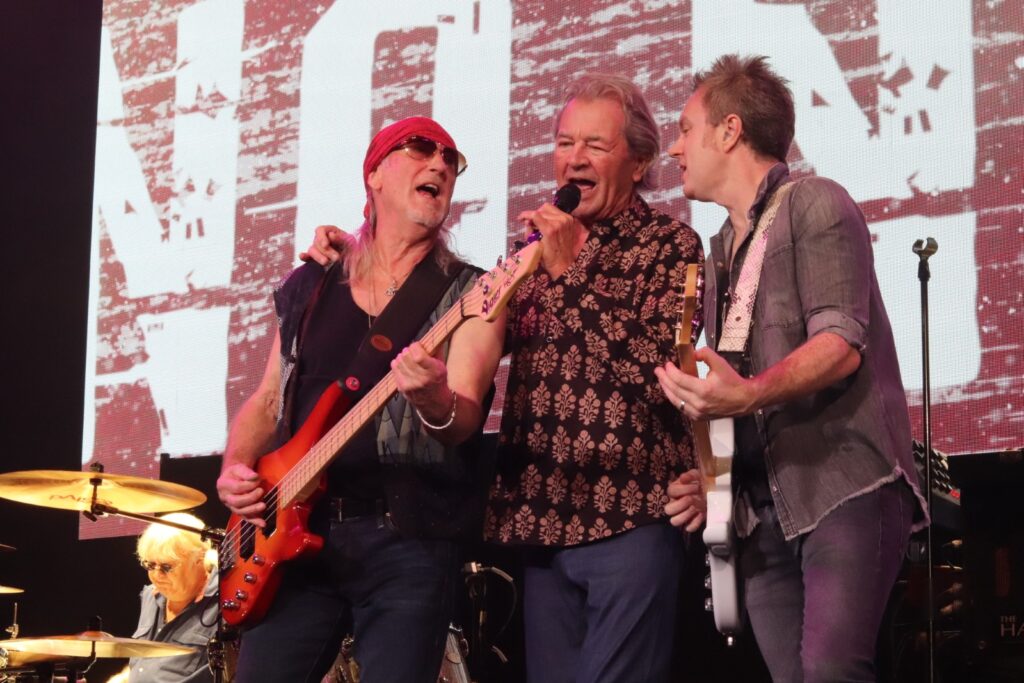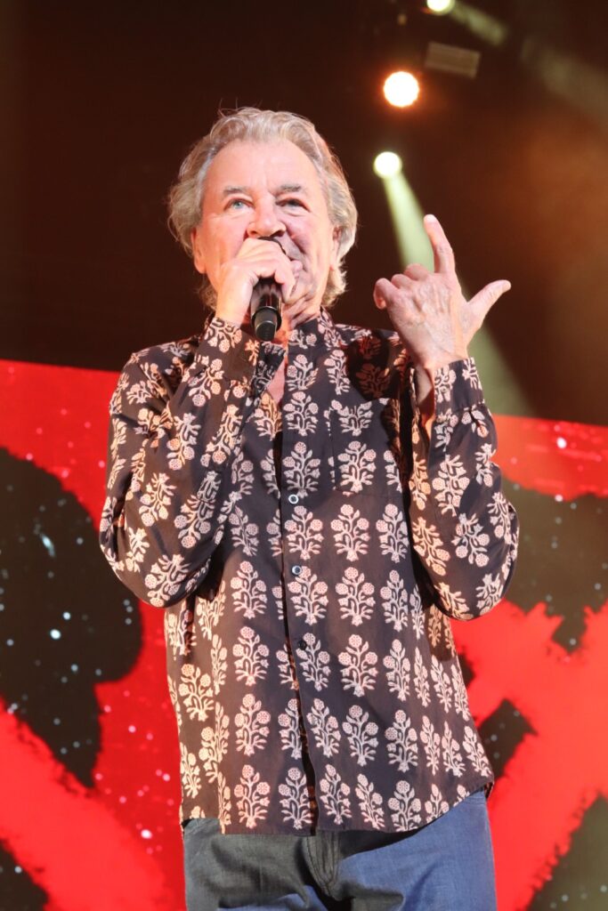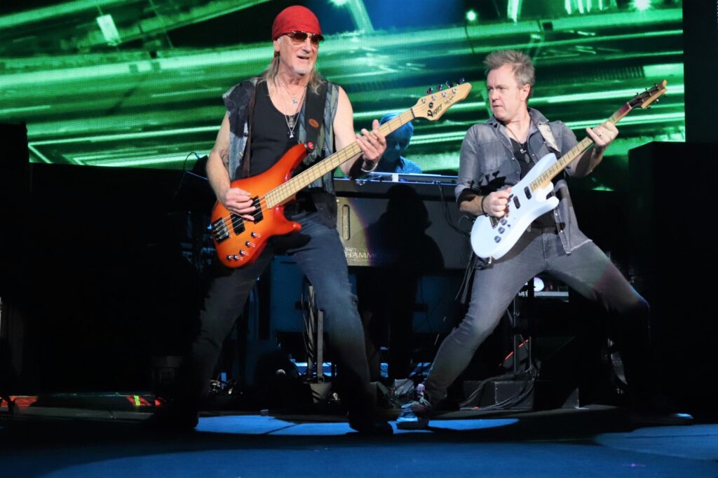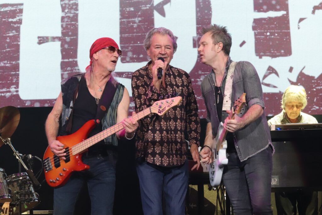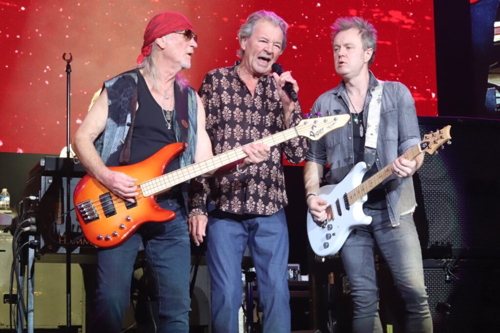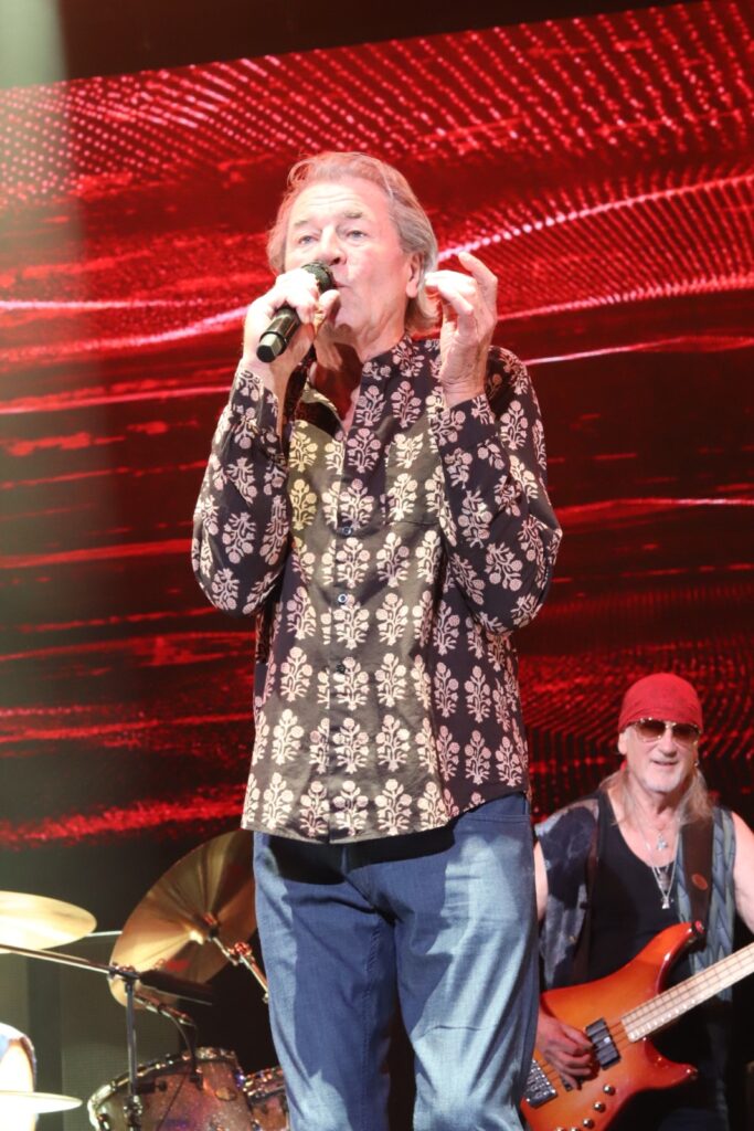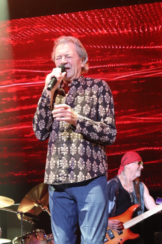 Sur scène, ils arrivent les uns après les autres et ça commence tout doucement avec « Mars The Bringer Of War » puis ça monte en puissance avec « Highway Star » et « Pictures of Home », extraits de l’album culte, Machine Head. Ian Gillan tire sur la corde et parvient toujours à chanter même si sa tessiture vocale ne parvient pas au niveau de « Child InTime ». Or, il n’est pas question de rester dans la nostalgie toute la soirée. Les Britanniques défendent également leurs nouveaux morceaux en enchaînant « No Need To Shout » et « Nothing At All » de Whoosh! (2020), illico-presto. La performance se veut authentique : l’émotion et la sincérité transpercent et effacent les méfaits de l’âge, notamment lorsque Ian, à la voix encore hautement perchée, entame l’épique « Uncommon Man » qu’il dédie à la mémoire de l’incroyable Jon Lord (cofondateur et claviériste, décédé en 2012).