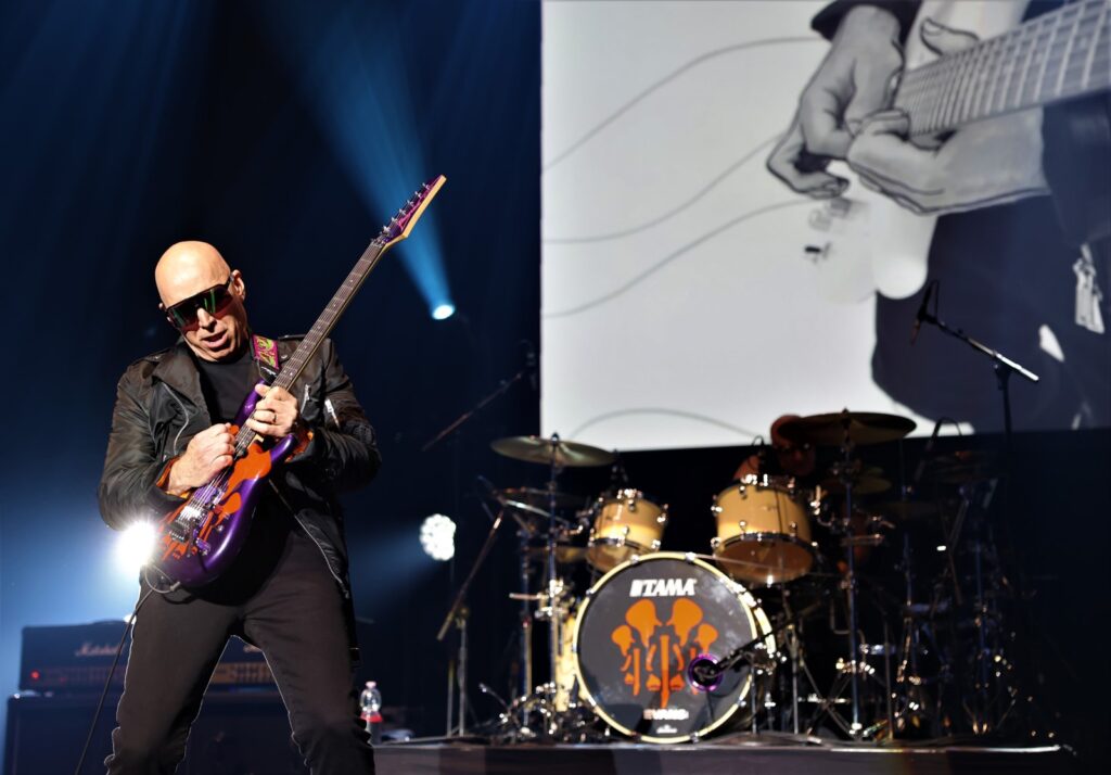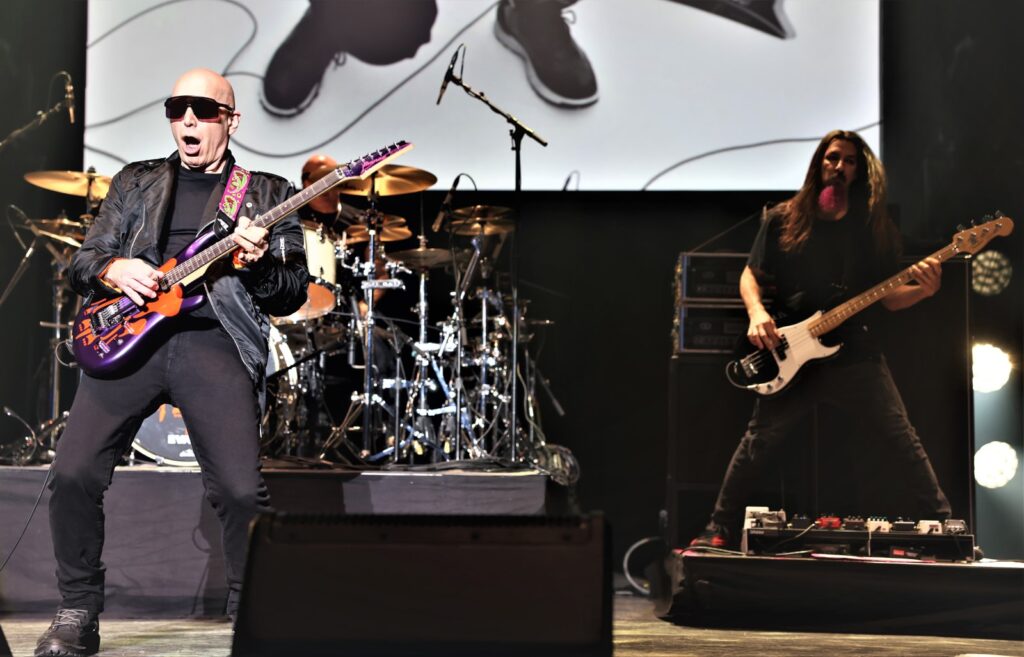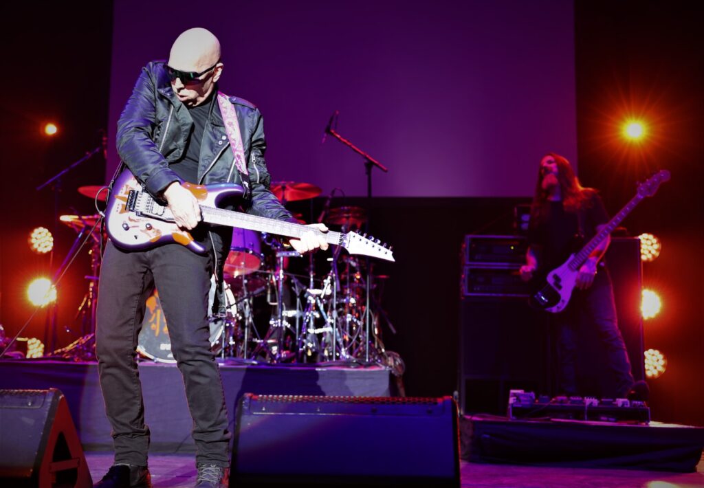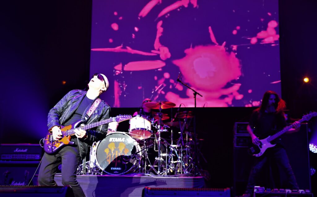Au tour de Rai maintenant de mettre en lumière son style musical sur son synthé rouge NordStage2 et de nous offrir un beau solo. C’est reparti pour le son psychédélique sur « Cool » et « Ali Farka, Dick Dale, an Alien and Me » avec un fond coloré aux couleurs chatoyantes, voire fluos. Puis se jouent les instrumentaux Shapeshifting (2020), « Teardrops », et Luminous Flesh Giants (1996), nous rappelant les 70’s-80’s. Le groupe revient sur un morceau plus lent de plus de 9 mintutes « Always With Me, Always With You » où Joe démontre des solis à la perfection. Place au fameux « Satch Boogie », certaines notes nous remémorant Deep Purple, encore un ancien groupe de J.S.