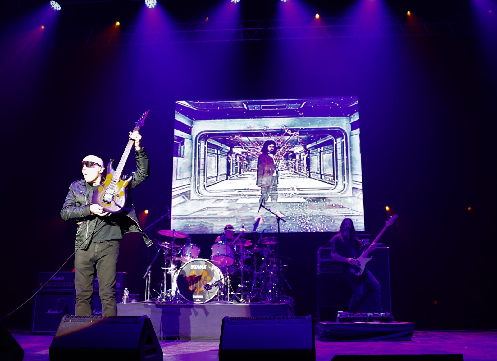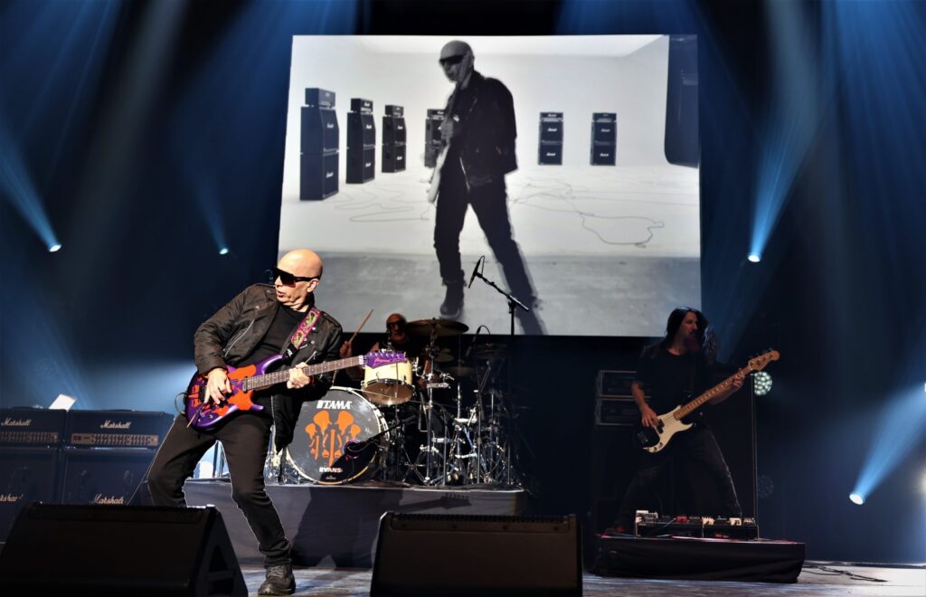 Sur « Flying in a Blue Dream », Satch se lance dans des soli infinis à l’instar des images projetant l’espace inter-planétaire infini. Un duo rythmique basse/batterie amorce « Spirits, Ghosts and Outlaw ». « Faceless », un moment de répit avec le slow du premier set où se dégagent quelques odeurs de fumée, vite repérées par la sécurité. « Crystal Planet », véritable chevauchée aux riffs plus hard et « Summer Song » restent dans l’ambiance et concluent ce premier set. Durant l’entracte d’une quinzaine de minutes défile un diaporama de photos prises en duos ou trios avec Satriani, que ce soient celles qui dévoilent ses yeux bleus et son bonnet ou d’autres avec son look lunettes, crâne dégarni.