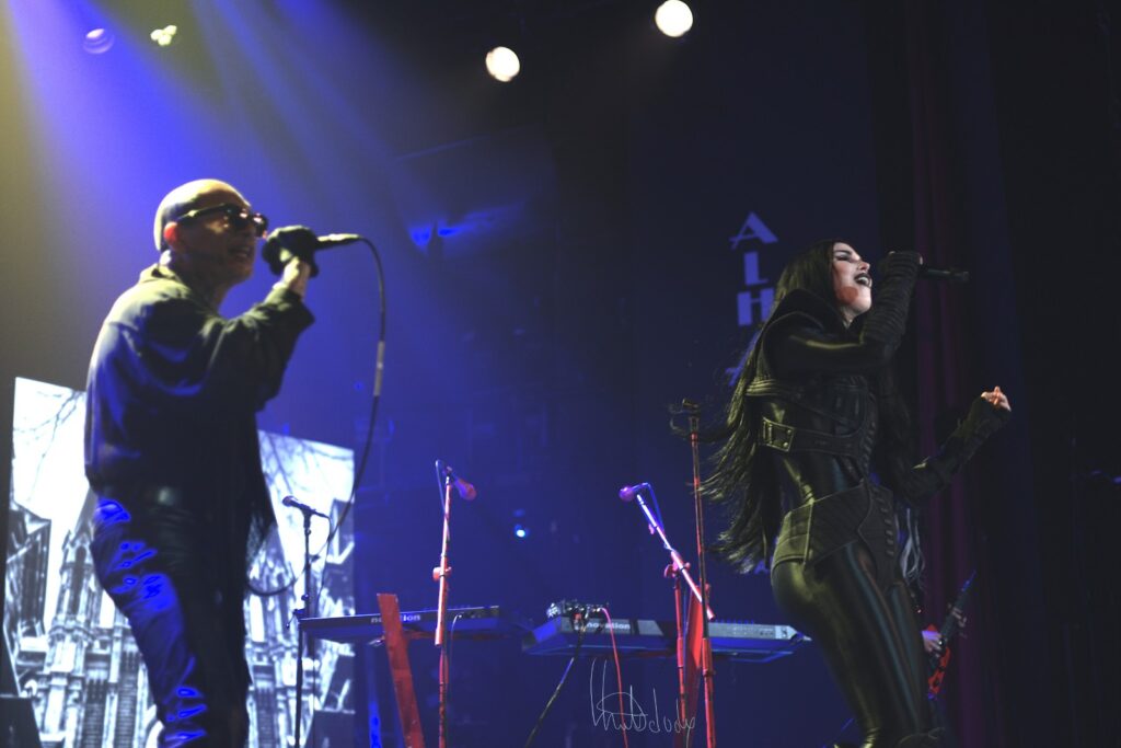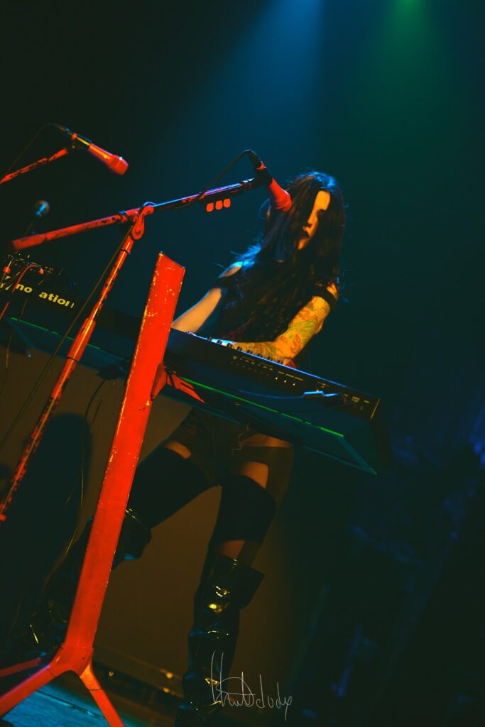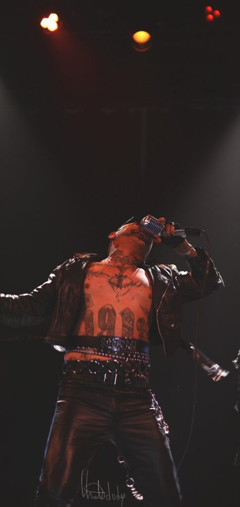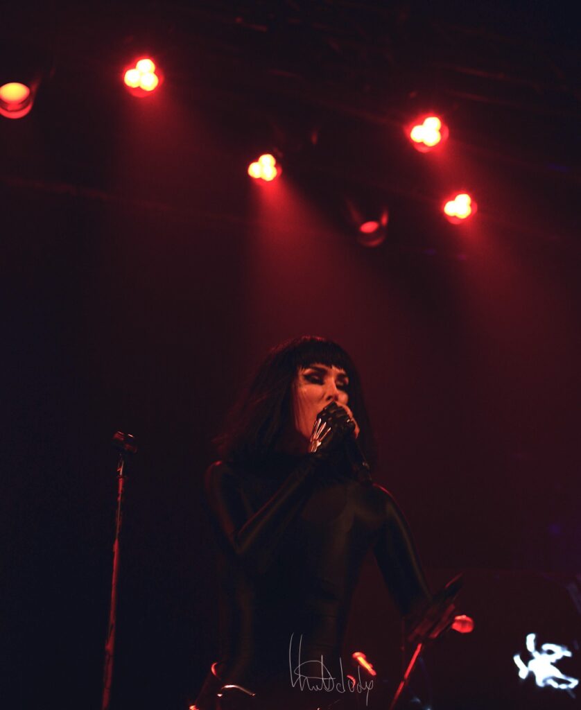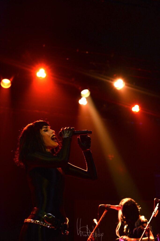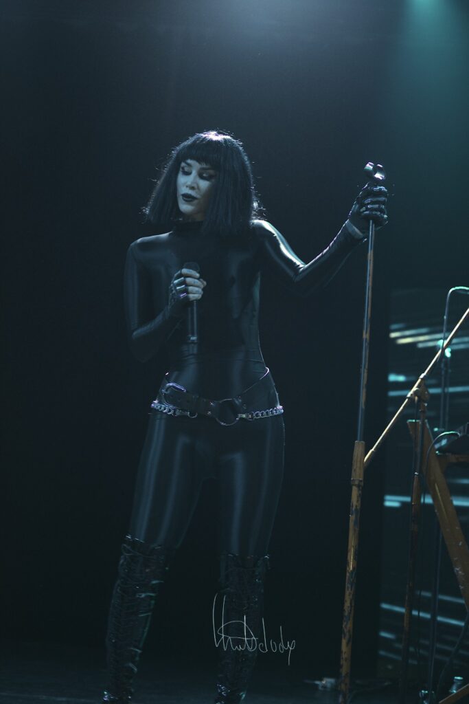 Puis vient le moment de la complicité partagée : Kat Von D invite son mari à la rejoindre sur scène, instaurant une nouvelle dynamique. Ensemble, ils interprètent Dead et Black Leather, deux titres où la complémentarité de leurs voix crée une alchimie rare. Les nuances se font plus riches, les émotions plus palpables, comme si chaque note racontait une histoire personnelle, une confidence intime. La tension sensuelle de « Black Leather » enveloppe la salle, mêlant audace et vulnérabilité, tandis que « Dead » révèle une mélancolie poignante.