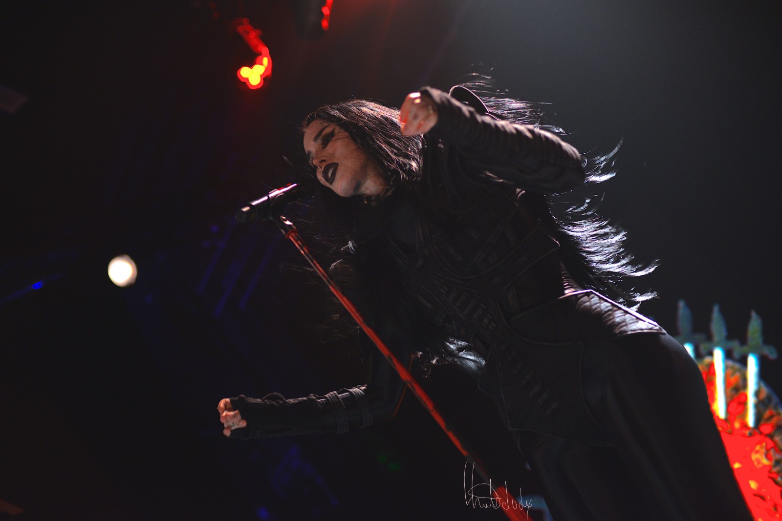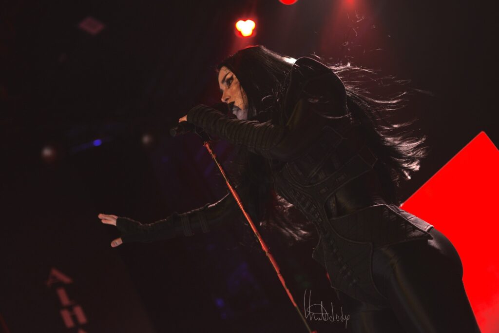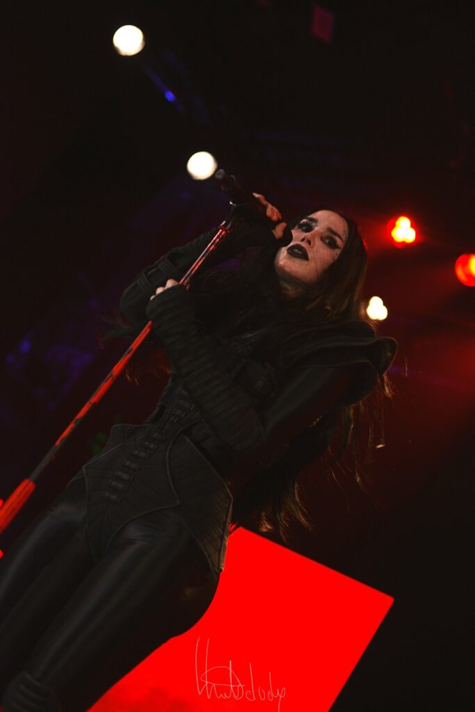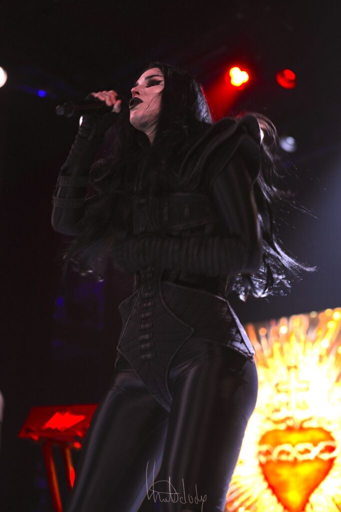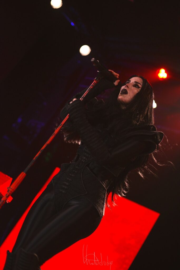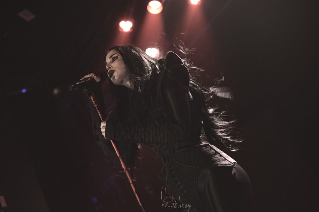 Le concert gagne en intensité avec l’enchaînement des morceaux Hate et Exorcism, où Kat Von D dévoile une facette plus sombre et torturée de son univers. Hate frappe fort dès les premières notes, la batterie martèle un rythme incisif tandis que la guitare rugit, créant un décor sonore à la fois brut et fascinant. La voix de Kat, à la fois puissante et déchirante, déverse une colère contenue qui électrise la salle. On sent toute l’ampleur émotionnelle du morceau, porté par une interprétation viscérale qui touche droit au cœur.