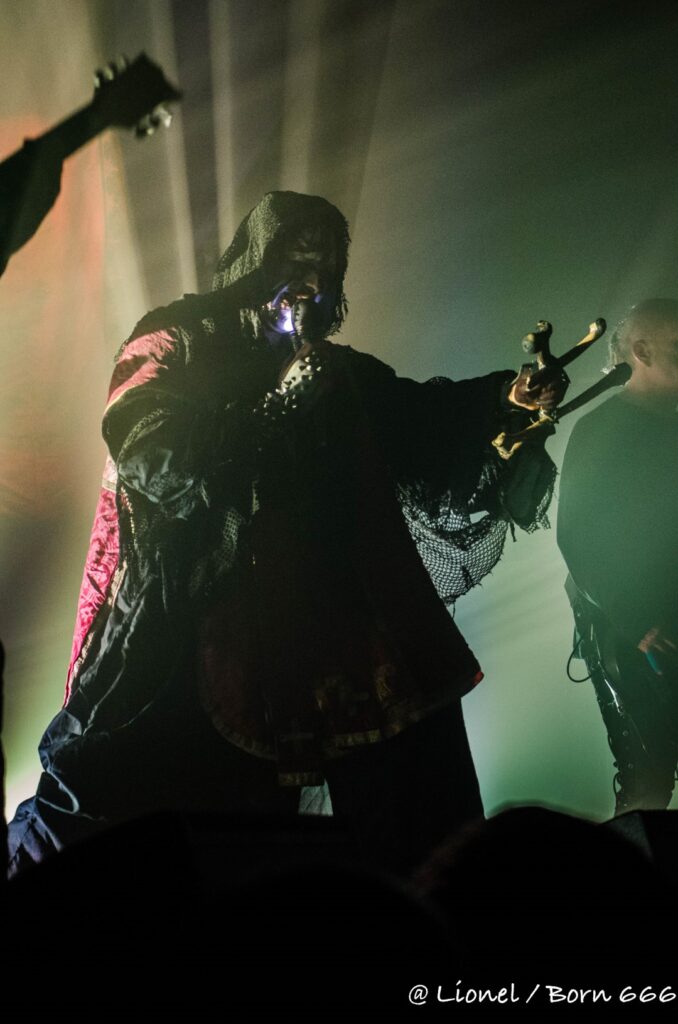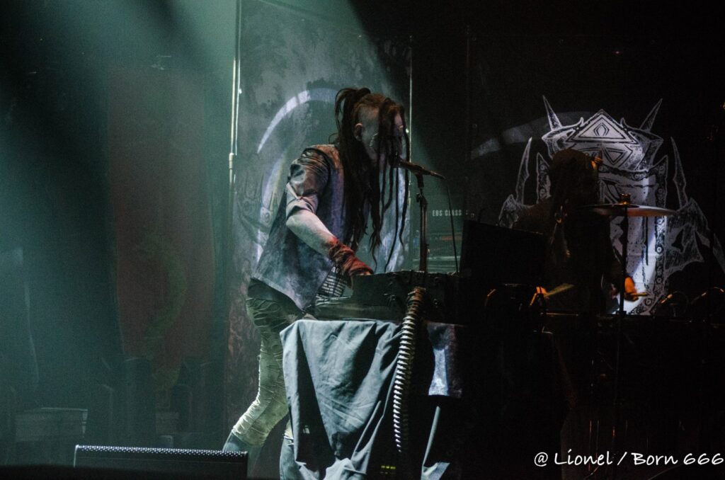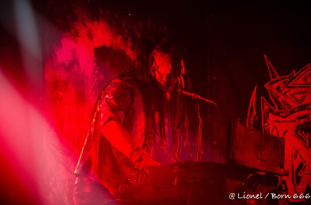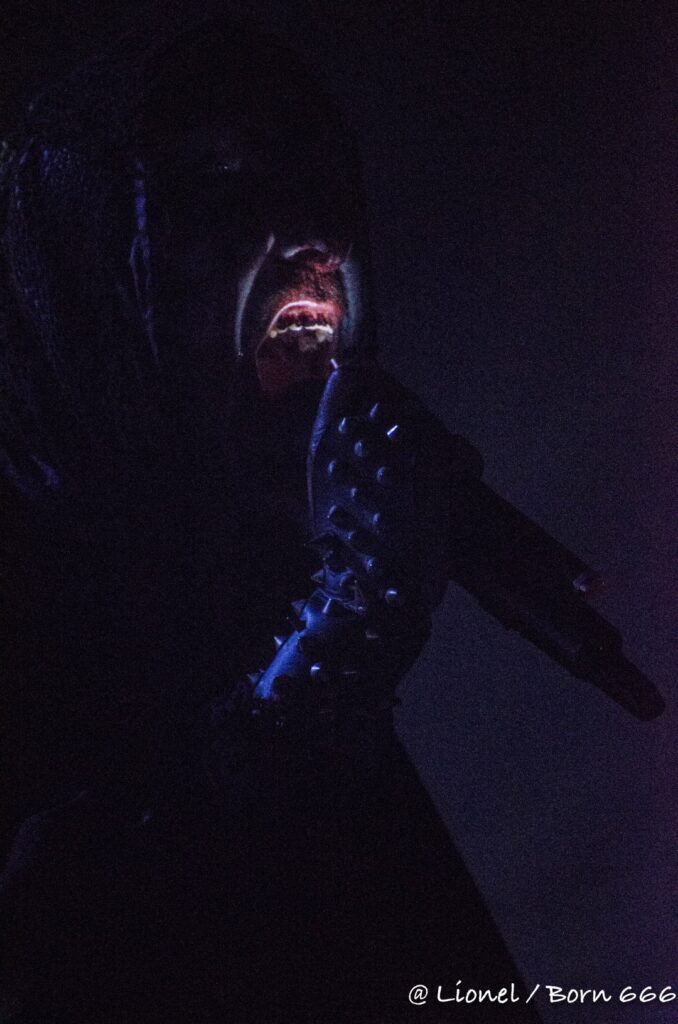 La forme de son masque avec ce nez pointu est des plus réussi. Il ressemble à la rencontre improbable entre un Elf maléfique et le masque de la marionnette dans Saw. Penché sur ses synthés, ce soir il interprète l’intégralité de son dernier album sorti en 2020 Spirit of Rebellion. Au milieu du set il est rejoint par un batteur lui aussi masqué tel un diablotin.