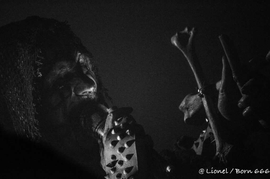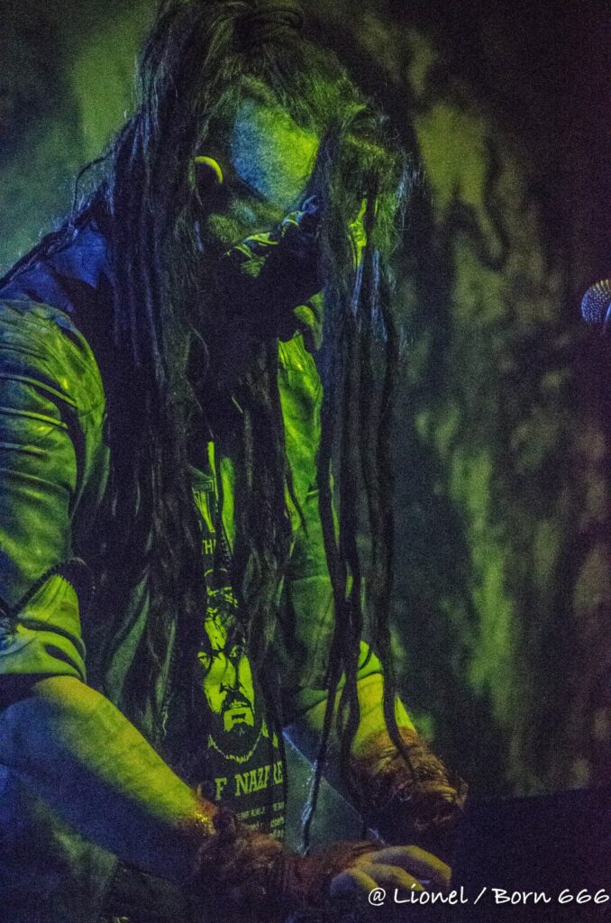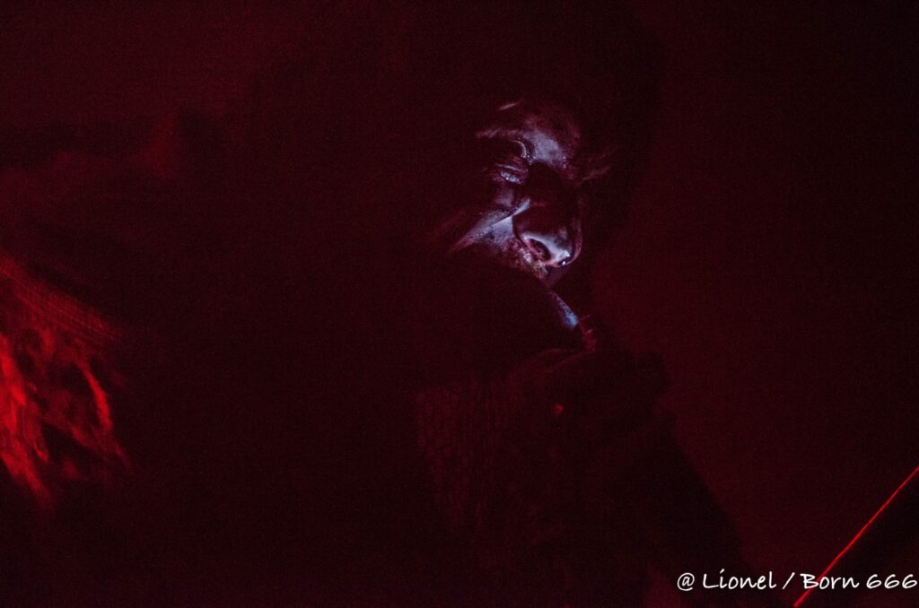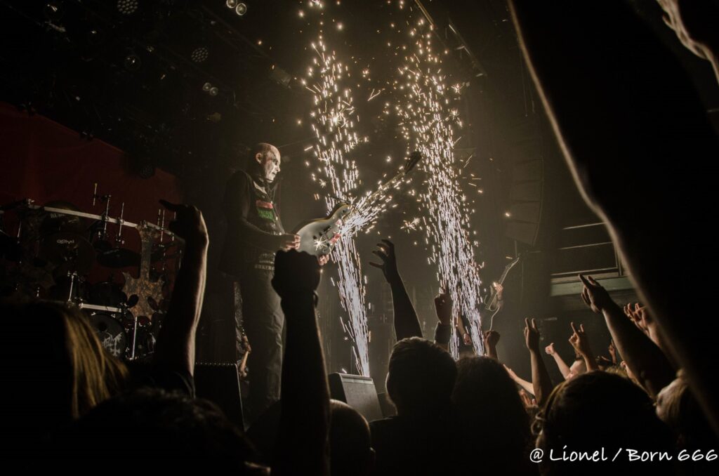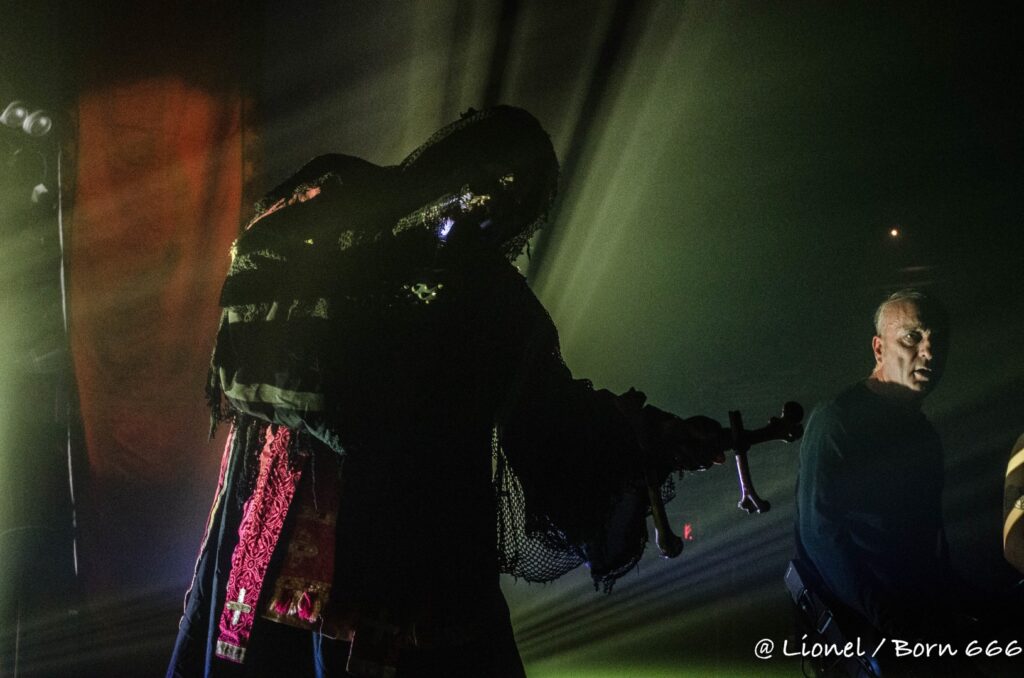 La forme de son masque avec ce nez pointu est des plus réussi. Il ressemble à la rencontre improbable entre un Elf maléfique et le masque de la marionnette dans Saw. Penché sur ses synthés, ce soir il interprète l’intégralité de son dernier album sorti en 2020 Spirit of Rebellion. Au milieu du set il est rejoint par un batteur lui aussi masqué tel un diablotin.