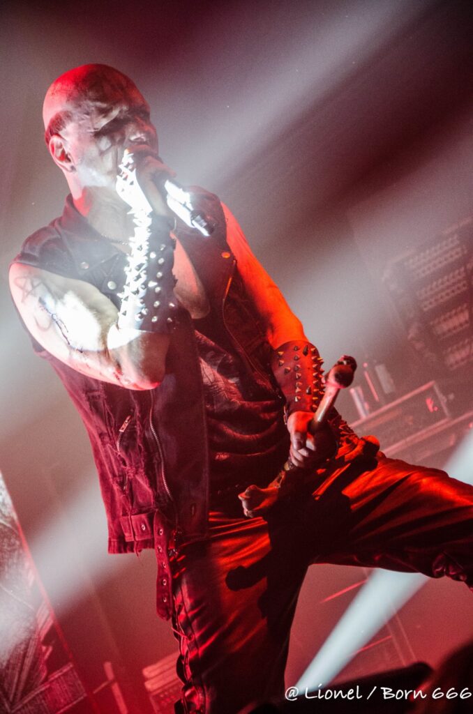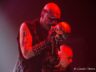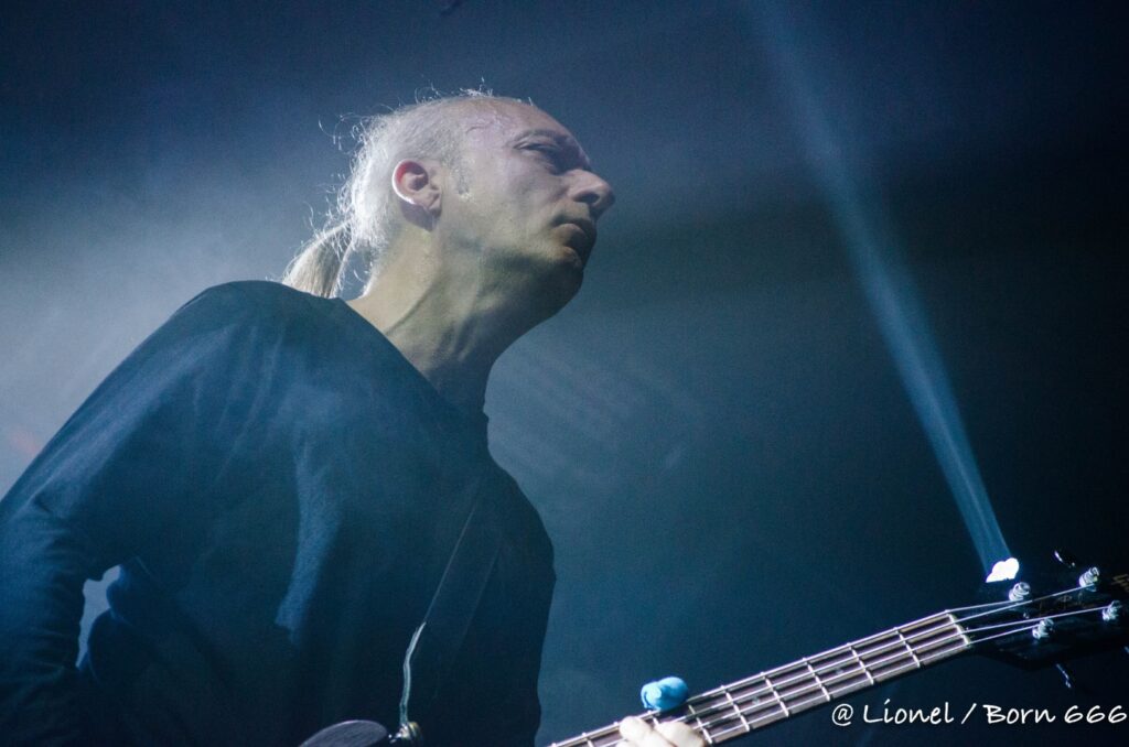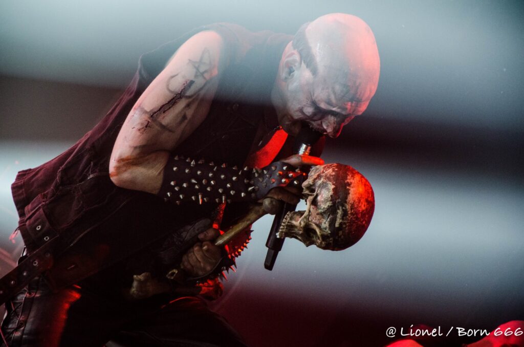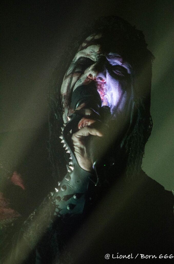 La trouvaille du jour est dans le micro dans lequel une Led éclaire le visage du chanteur quand les lights sont en stand-bye. Cela donne un côté encore plus inquiétant à son visage grimé le rendant encore plus malsain. Sa croix d’os est toujours là et sert à sa gestuelle et à ses échanges avec les premiers rangs. Sans oublier la tête de mort (complice indispensable) qui devient porte micro ou de double d’outre-tombe sur certains titres.