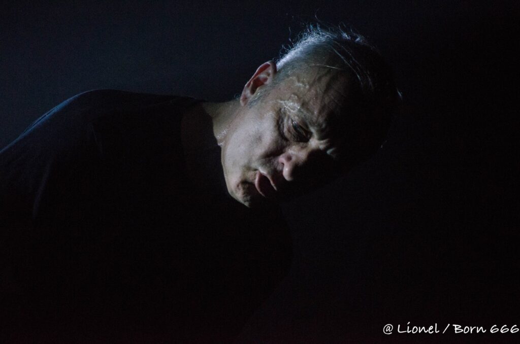 L’homme au masque inquiétant ouvre la soirée avec son dark ambiant et industriel. Les logos du groupe sont à peine éclairés et c’est dans une ambiance feutrée que le public écoute religieusement la musique faites de nappes de synthés et parfois rehaussée de sa voix.