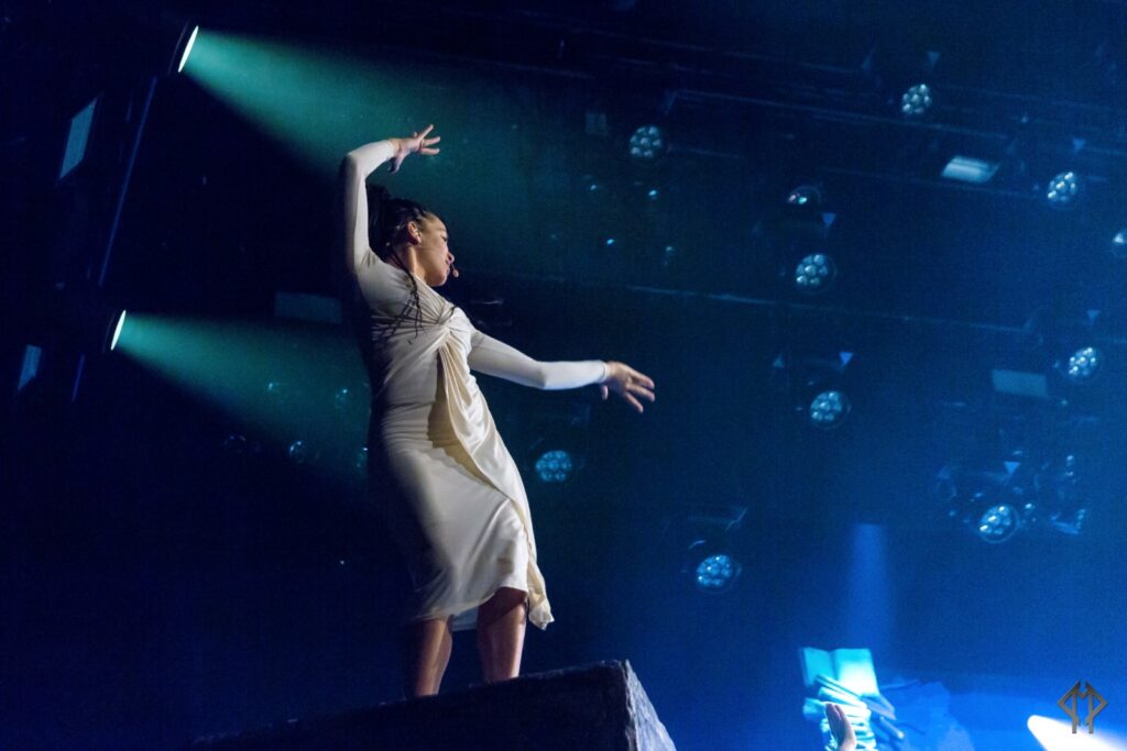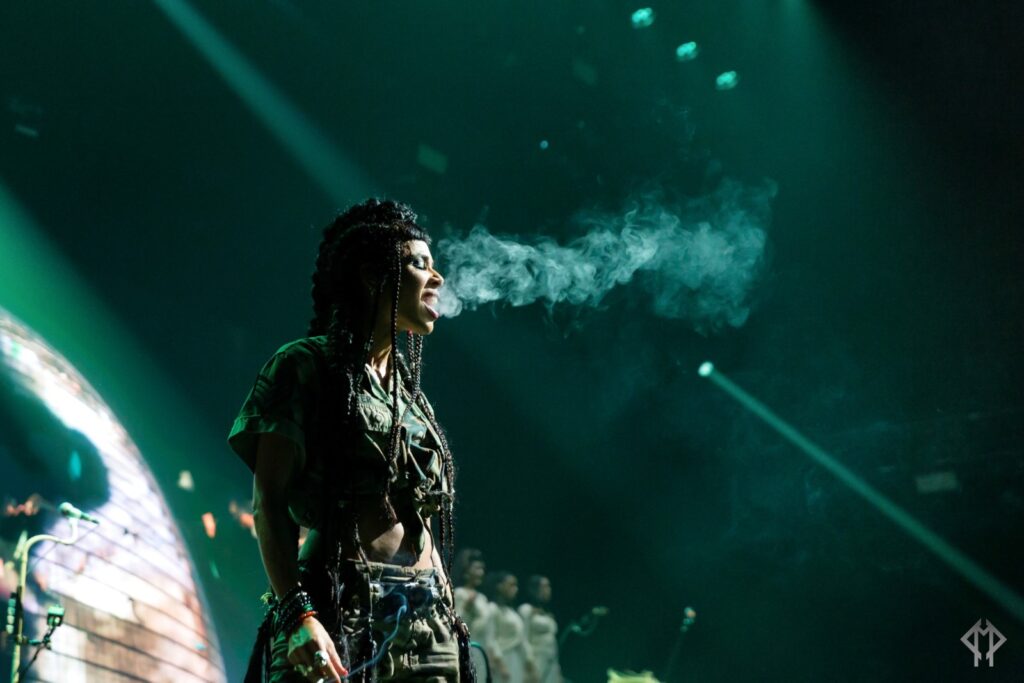 Après une mise en place de la scène assez rapide le noir se fait dans le Zenith … pas totalement … les gradins restent éclairés et on voit 3 membres du groupe (Frah, Sam et Cc) arriver depuis les coulisses et profiter d’un bain de foule en traversant la salle dans toute sa largeur. Le concert n’a pas encore commencé que le Zenith est déjà en fusion ! Entrée réussie. Puis contre toute attente, le trio prend place sur une petite scène au milieu de la fosse, et, comme il s’agit d’une tournée spéciale, entame le concert d’une façon tout aussi spéciale par un enchainement de 3 titres en version acoustique (Picky) puis bluesy (Gung Ho, Run, run run). Les autres membres partiellement cachés par un rideau translucide les accompagnent au son de la contre basse, d’un clavier aux accents d’orgue Hamond et d’une batterie syncopée.
