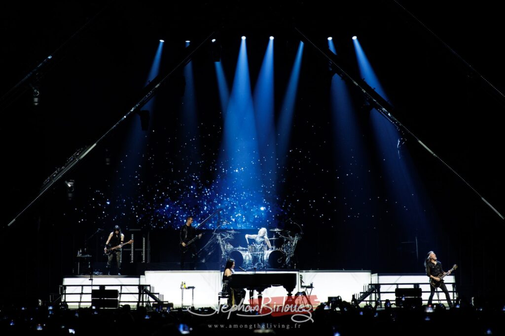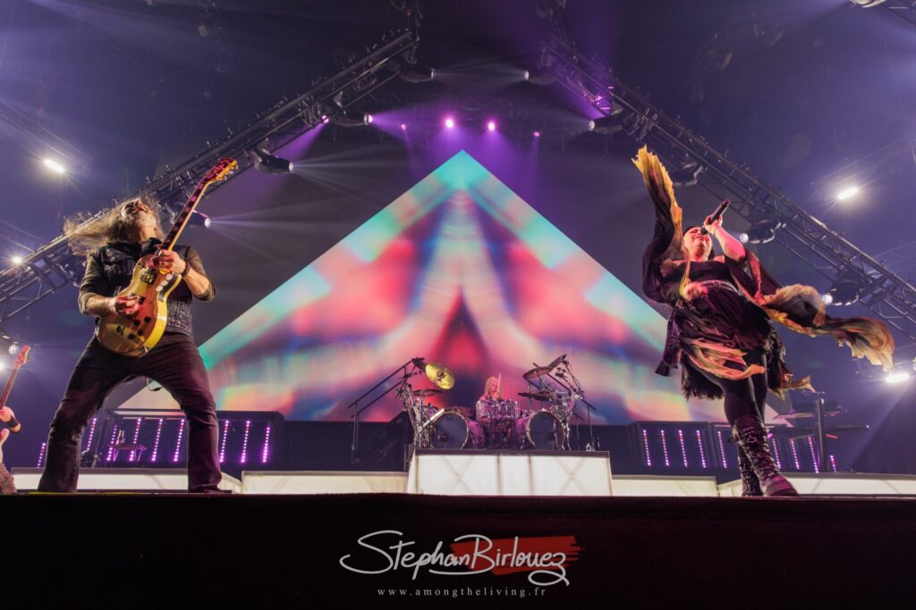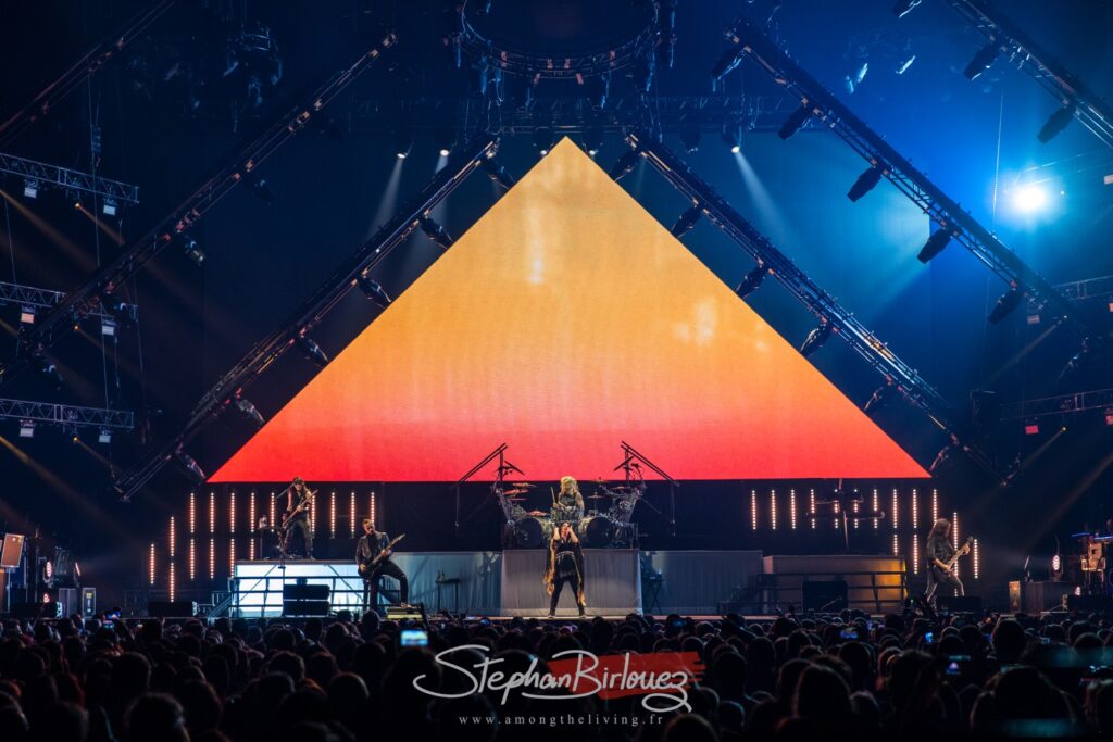 Pour Paris c’est EVANESCENCE qui ouvre le bal, avec Broken Pieces Shine, titre issu de leur dernier opus The Bitter Truth sorti l’année dernière et qui aura la part belle sur la setlist de ce soir. Un décor assez monumental s’offre au public, avec une pyramide lumineuse en guise d’écran.