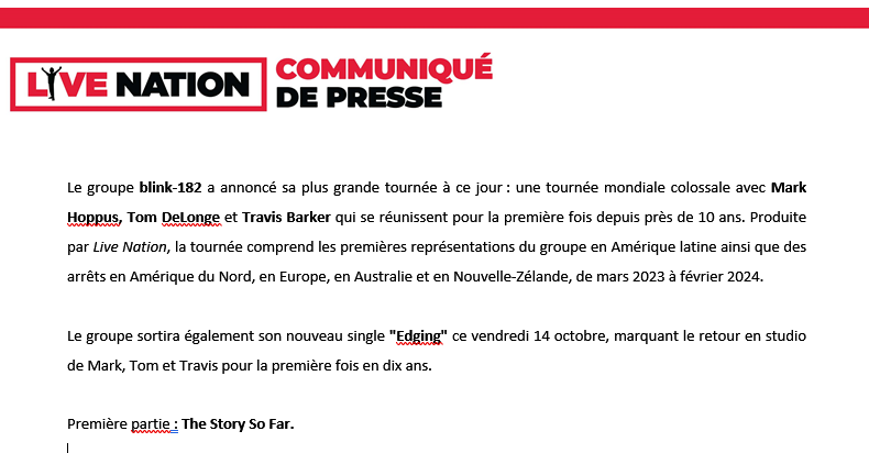 Newsblink-182 en concert à Paris en octobre 2023 ! par Stephan Birlouez11 octobre 202218 janvier 2025 Dans la foulée d’une vidéo que le groupe vient juste de poster sur ses réseaux sociaux, blink-182 annonce un concert à Paris, une nouvelle chanson et pas que… Mise en vente : lundi 17 octobre à 10h00