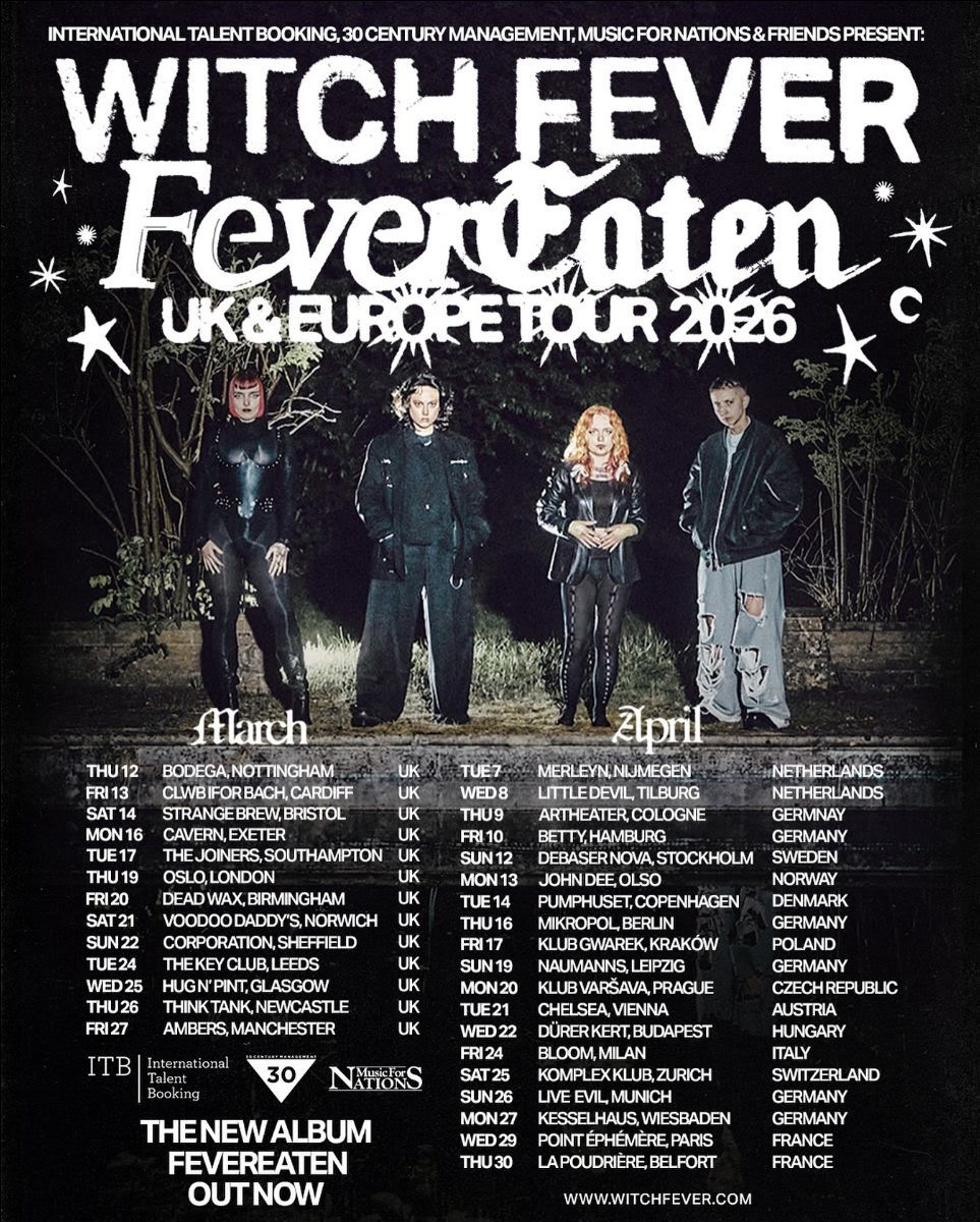 Souvent sur les routes, WITCH FEVER a lancé son Fevereaten UK & Europe Tour à la mi-Mars. Depuis, c’est par plus d’une trentaine de dates à travers le vieux continent que le quatuor continue de défendre sur scène FEVERATEN (Music For Nations / SONY).